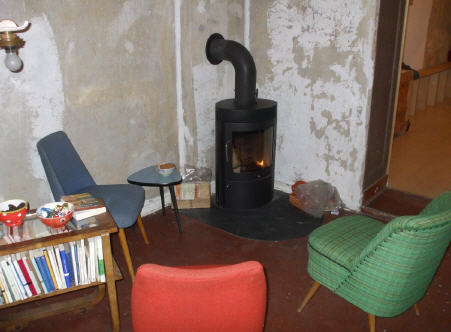 Der Ort „wortwedding“ ist ein Zufluchtsort, minimalistisch eingerichtet, ein Ofen, ein Buchständer, drei Sessel, etwas Gebäck, eine Kerze, später auch noch Teetassen. Auch die vielen Veranstaltungs-Flyer sind in den Hinterraum verbannt. Sie sind zu bunt, lenken ab, verwirren.